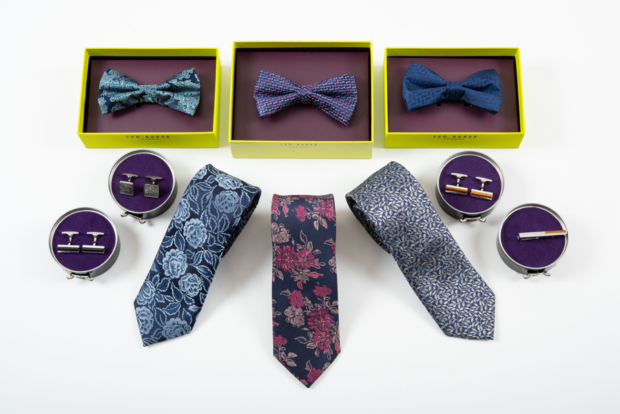 Mach die Fliege: Dunkelblaue Fliege mit blumig-orientalischem Muster in Türkis, dunkelblaue Fliege mit buntem Maschenmuster und blaue in sich gemusterte Fliege, alle von Ted Baker. Runde Sache: Manschettenknöpfe in verschiedenen Formen in schwarzen, runden Dosen von Ted Baker. Blumig: Dunkelblaue Krawatte mit blassblauem Rosen-Blumenmuster, dunkelblaue Krawatte mit rot-blassrosa Blumenmuster und dunkelblaue Krawatte mit Blättermuster, alle von Ted Baker.