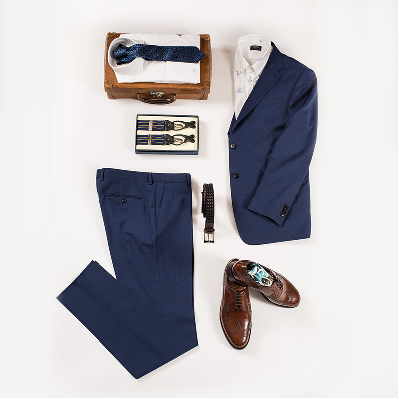 Anzug € 899,- / Krawatte € 129,- / Hemd € 189,- / Hosenträger € 99,- / Schuhe € 349,-